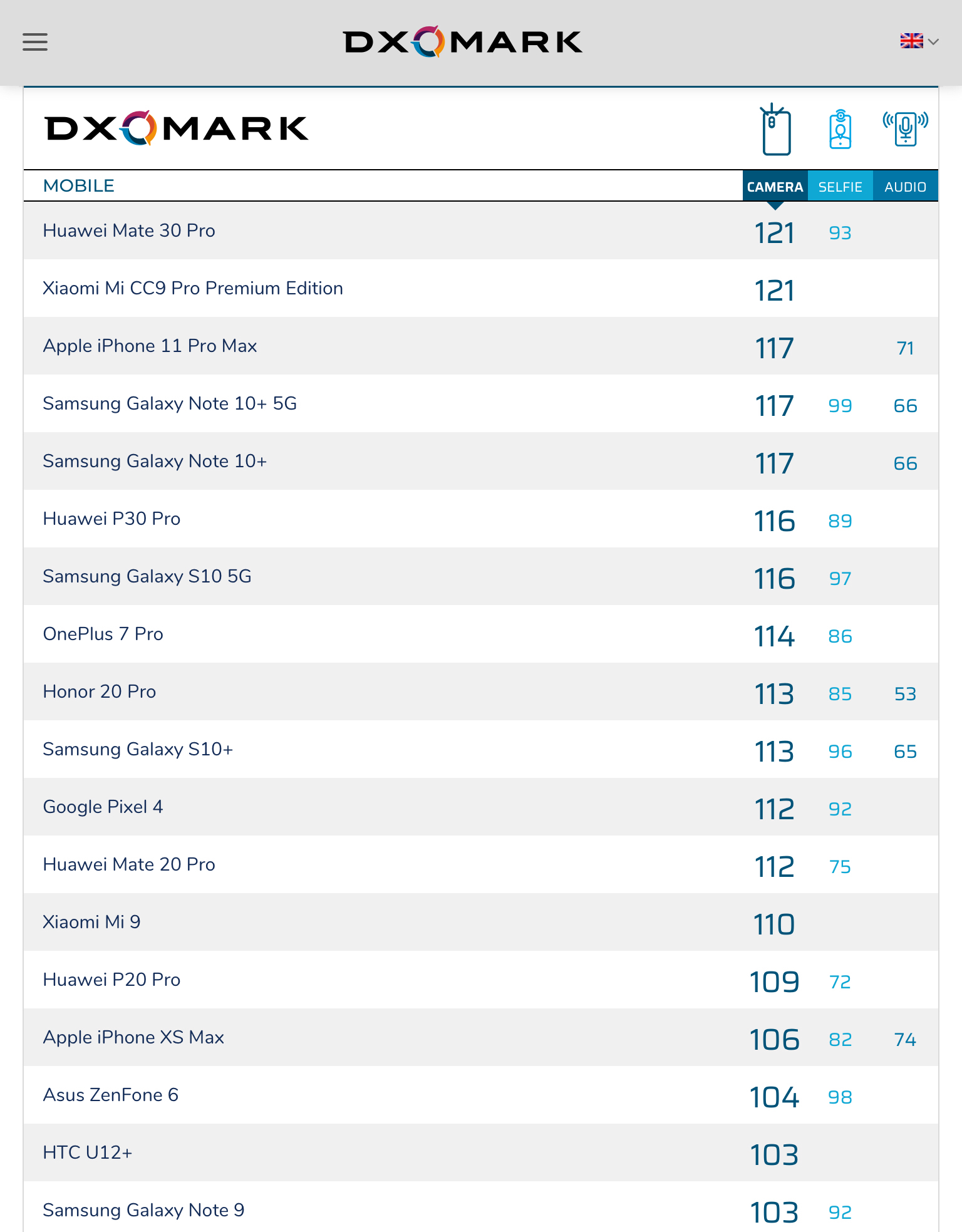 Siapa sangka ponsel tersebut tembus dengan skor 121, memepet posisi Huawei Mate 30 Pro dan meninggalkan Iphone 11 Pro Max 4 dengan poin telak.